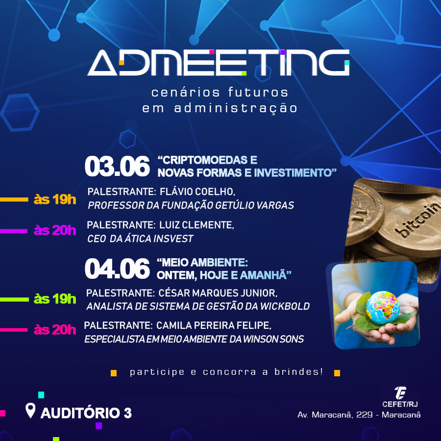 Nos dias 3 e 4 de junho, os alunos formandos do curso técnico subsequente em Administração do campus Maracanã realizarão um evento, como parte do trabalho de conclusão de curso, com palestras de áreas ligadas à tecnologia e ao meio ambiente. O evento contará com palestrantes das áreas educacional e empresarial, cada qual apresentando seus pontos de vista e expectativas para o futuro.