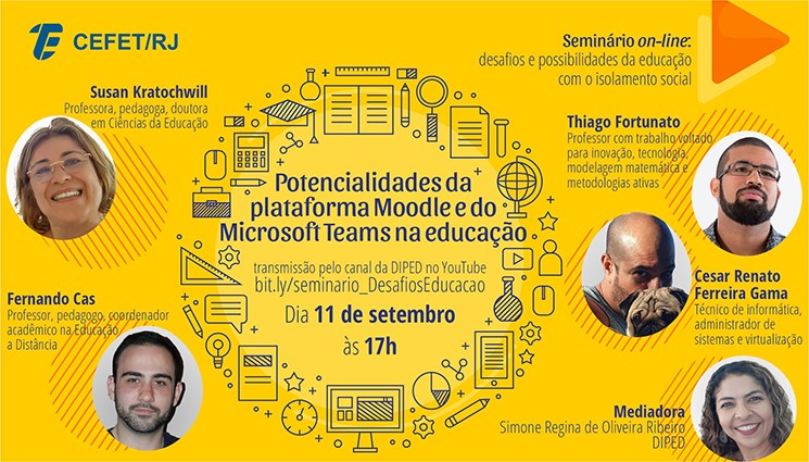 Visando debater o uso de ferramentas tecnológicas nas práticas de ensino remoto e híbrido e na educação a distância (EAD), o quarto encontro virtual do projeto “Seminário on-line: desafios e possibilidades da educação com o isolamento social” terá como tema “Potencialidades da plataforma Moodle e do Microsoft Teams na educação”. A live será realizada na sexta-feira (11), às 17h, pelo canal da Divisão de Projetos Educacionais (DIPED) do Cefet/RJ no YouTube. Não haverá lista de inscritos. Para obter certificado de participação, será preciso preencher a lista de presença que será liberada durante a transmissão.