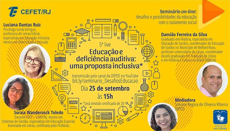 Com o objetivo de ampliar a discussão sobre a trajetória educacional e social do estudante surdo, o projeto “Seminário on-line: desafios e possibilidades da educação com o isolamento social” terá como tema “Educação e deficiência auditiva: uma proposta inclusiva”. A live será realizada na sexta-feira (25), às 15h, pelo canal da Divisão de Projetos Educacionais (DIPED) do Cefet/RJ no YouTube. Não haverá lista de inscritos. Para obter o certificado de participação, será preciso preencher a lista de presença que será liberada durante a transmissão.