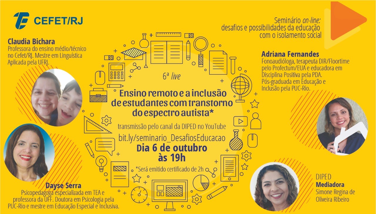 O sexto encontro virtual do projeto “Seminário on-line: desafios e possibilidades da educação com o isolamento social” terá como tema “Ensino remoto e a inclusão de estudantes com transtorno do espectro autista”. A live será realizada na próxima terça-feira (6), às 19h, pelo canal da Divisão de Projetos Educacionais (DIPED) do Cefet/RJ no YouTube. Não haverá lista de inscritos. Para obter o certificado de participação, será preciso preencher a lista de presença que será liberada durante a transmissão.