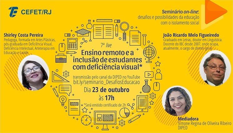 Na próxima sexta-feira (23), o projeto “Seminário on-line: desafios e possibilidades da educação com o isolamento social” abordará o tema “Ensino remoto e a inclusão de estudantes com deficiência visual”. A live será transmitida a partir das 17h, pelo canal da Divisão de Projetos Educacionais (DIPED) do Cefet/RJ no YouTube. Não haverá lista de inscritos. Para obter o certificado de participação, será preciso preencher a lista de presença que será liberada durante a transmissão. A videoconferência irá disponibilizar certificado de duas horas.