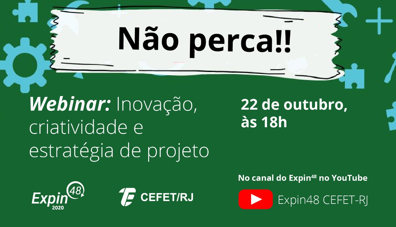 Na próxima quinta-feira (22), o Cefet/RJ promove o webinar “Inovação, criatividade e estratégia de projeto”. O encontro virtual terá duas palestras: “Criatividade e brainstorming”, que será ministrada pela professora do Cefet/RJ Cristina Gomes, e “Criação e estratégias de projeto”, que será ministrada por Marcelo Savi, professor da Universidade Federal do Rio de Janeiro (Coppe/UFRJ). O evento on-line é aberto ao público e terá transmissão a partir das 18h pelo canal do Expin48 no YouTube.
