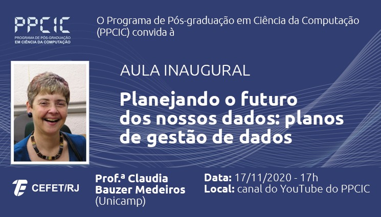 No dia 17 de novembro de 2020, o Programa de Pós-graduação em Ciência da Computação (PPCIC) do Cefet/RJ irá realizar a aula inaugural “Planejando o futuro dos nossos dados: planos de gestão de dados”, às 17h, no formato de live, a ser transmitida no canal do PPCIC no YouTube. A palestra será ministrada pela professora convidada Claudia Bauzer Medeiros, da Universidade Estadual de Campinas (Unicamp).