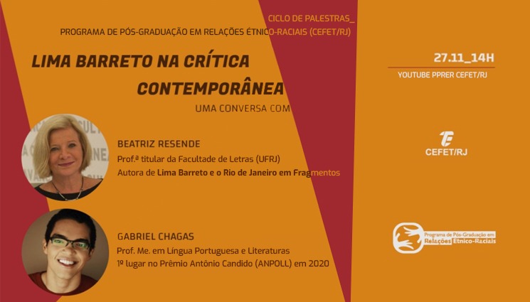 O segundo encontro do ciclo de palestras on-line do Programa de Pós-graduação em Relações Étnico-Raciais (PPRER) do Cefet/RJ abordará o escritor Lima Barreto na crítica contemporânea em uma conversa com a professora da UFRJ Beatriz Resende, especialista na obra do autor, e o professor Gabriel Chagas. A atividade será realizada no dia 27 de novembro, às 14 horas, e será transmitida pelo canal do PPRER no YouTube.