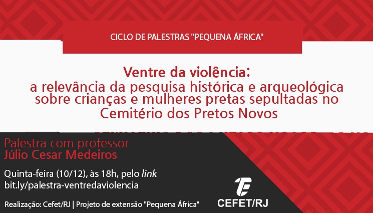 O projeto de extensão “Pequena África”, do Cefet/RJ campus Maracanã, realizará, na próxima quinta-feira (10), a palestra “Ventre da violência: a relevância da pesquisa histórica e arqueológica sobre crianças e mulheres sepultadas no Cemitério dos Pretos Novos”. O encontro on-line estava previsto para acontecer na última quinta-feira (3), mas, em virtude de problemas técnicos, foi reagendado para esta semana. A live é aberta ao público e oferecerá certificado aos participantes. A transmissão iniciará às 18h pelo Microsoft Teams.