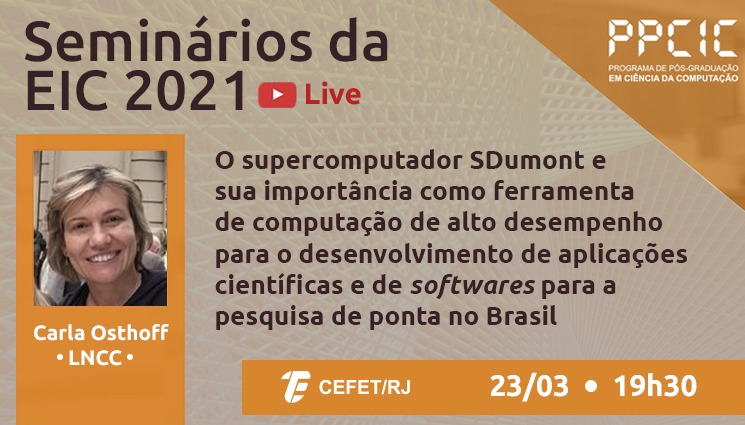 O projeto Seminários da Escola de Informática e Computação (SEIC) realizará, na próxima terça-feira (23), um encontro virtual com o tema “O supercomputador SDumont e sua importância como ferramenta de computação de alto desempenho para o desenvolvimento de aplicações científicas e de softwares para a pesquisa de ponta no Brasil”. A palestra inicia às 19h30 e será transmitida pelo canal do Programa de Pós-graduação em Ciência da Computação (PPCIC) do Cefet/RJ no YouTube.