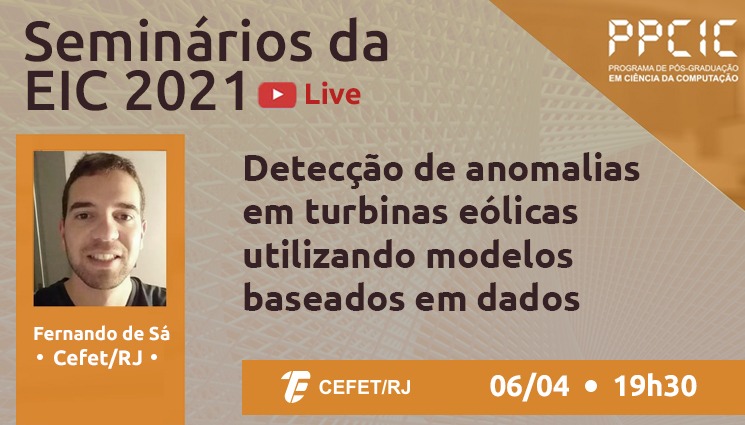 O projeto Seminários da Escola de Informática e Computação (SEIC) realizará, nesta terça-feira (6), uma live com o tema “Detecção de anomalias em turbinas eólicas utilizando modelos baseados em dados”. O encontro inicia às 19h30 e será transmitido pelo canal do Programa de Pós-graduação em Ciência da Computação (PPCIC) do Cefet/RJ no YouTube. A iniciativa é aberta ao público. Para obter certificado de participação, é necessário fazer a inscrição prévia e assinar a lista de presença durante o evento.