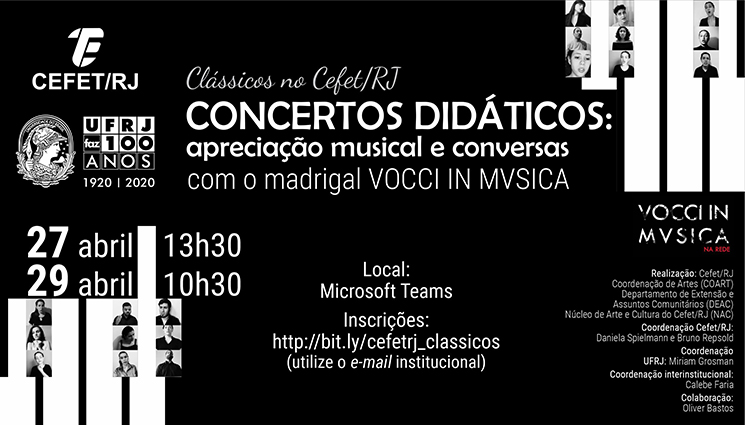 Clássicos no Cefet/RJ – Concertos Didáticos on-line recebem o grupo Vocci in Mvsica Datas: 27/04 (às 13h30) e 29/04 (às 10h30) Local: Microsoft Teams Inscrições: http://bit.ly/cefetrj_classicos (utilize o e-mail institucional) |