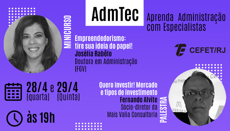 O curso técnico em Administração, em parceria com a Secretaria de Finanças do Grêmio Estudantil do campus Maracanã, convida os alunos do Cefet/RJ para o AdmTec. O evento será composto por um minicurso e uma palestra, que ocorrerão nos dias 28 e 29 de abril, por meio da plataforma Microsoft Teams. Serão abordados temas ligados a Finanças e Negócios por especialistas dessas áreas.