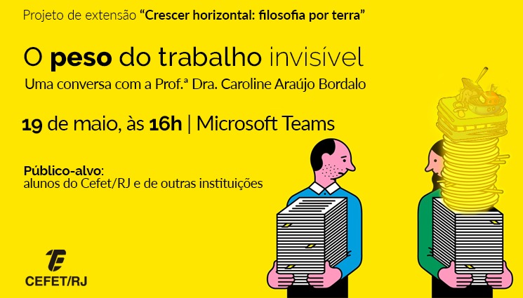 No dia 19 de maio, o projeto de extensão “Crescer horizontal: filosofia por terra” do campus Maracanã do Cefet/RJ irá promover uma conversa on-line com a professora e doutora em Ciências Sociais Caroline Araújo Bordalo. A atividade tem como título “O peso do trabalho invisível” e visa promover um diálogo sobre temas relacionados ao feminismo e discutir como parte do trabalho que recai sobre as mulheres se torna invisível em nossa sociedade.