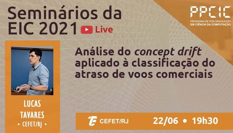 O projeto Seminários da Escola de Informática e Computação (SEIC) realizará, na terça-feira (22/06), uma live com o tema “Análise do concept drift aplicado à classificação do atraso de voos comerciais”. A palestra iniciará às 19h30 e será transmitida pelo canal do Programa de Pós-graduação em Ciência da Computação (PPCIC) do Cefet/RJ no YouTube. A iniciativa é aberta ao público. Para obter certificado de participação, é necessário fazer a inscrição prévia e assinar a lista de presença durante o evento.