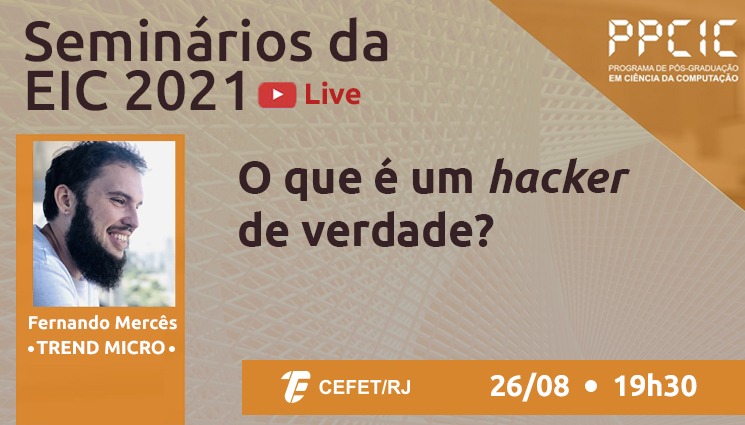 Na quinta-feira (26/08), o projeto Seminários da Escola de Informática e Computação (SEIC) apresentará o tema "O que é um hacker de verdade?". O encontro on-line está previsto para acontecer no dia 26 de agosto, às 19h30, e terá transmissão pelo canal do Programa de Pós-Graduação em Ciência da Computação (PPCIC) do Cefet/RJ no YouTube. A iniciativa é aberta ao público em geral. Para obter certificado de participação, é necessário fazer a inscrição prévia e assinar a lista de presença durante o evento.