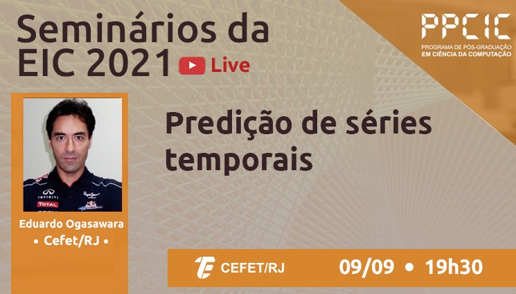 No dia 9 de setembro, às 19h30, a programação do projeto Seminários da Escola de Informática e Computação (SEIC) contará com a apresentação do professor Eduardo Ogasawara, cujo título é “Predição de séries temporais”. O evento é aberto a alunos do Cefet/RJ e à comunidade em geral de Computação e será transmitido pelo canal do Programa de Pós-Graduação em Ciência da Computação (PPCIC) do Cefet/RJ no YouTube. Para se inscrever no seminário, acesse SEIC – Eduardo Ogasawara.