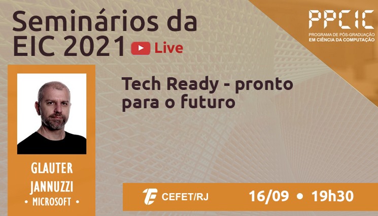 Na próxima quinta-feira (16), às 19h30, a programação do projeto Seminários da Escola de Informática e Computação (SEIC) contará com a apresentação de Glauter Jannuzzi, da Microsoft. A palestra "Tech Ready – pronto para o futuro" será transmitida pelo canal do Programa de Pós-Graduação em Ciência da Computação (PPCIC) do Cefet/RJ no YouTube. O evento é aberto a alunos da instituição e à comunidade em geral de Computação. Para se inscrever no seminário, acesse SEIC – Glauter Jannuzzi.