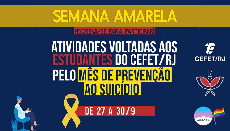 O Grêmio Estudantil do Cefet/RJ campus Maracanã, por meio da sua Secretaria de Pautas Sociais, convida os alunos de toda a instituição para participarem da Semana de Prevenção ao Suicídio, que ocorrerá de 27 a 30 de setembro. O evento terá palestras e rodas de conversa com psicólogos e professores do Cefet/RJ, além de dinâmicas e reflexões com os alunos presentes.