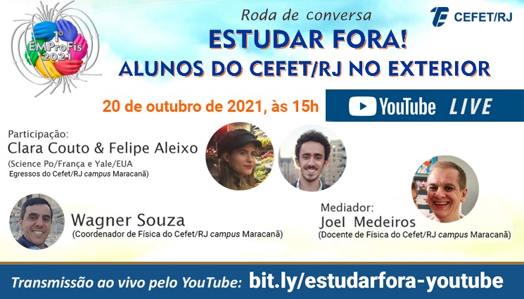 No dia 20 de outubro, às 15h, os ex-alunos do Cefet/RJ campus Maracanã Clara Couto e Felipe Aleixo participarão de uma roda de conversa on-line sobre suas trajetórias como estudantes no exterior. O evento é parte do 1º Encontro Multicampi de Professores de Física do Cefet/RJ e será transmitido pelo YouTube.