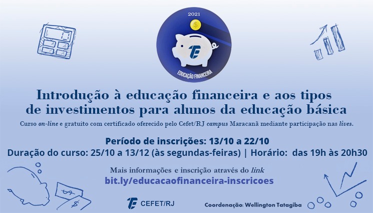 A partir do dia 25 de outubro, o Cefet/RJ irá ofertar o curso “Introdução à educação financeira e aos tipos de investimentos para alunos da educação básica”. Em sua primeira edição on-line, a iniciativa visa fornecer informações que ajudem o aluno a entender a linguagem financeira do cotidiano para gerir melhor seu orçamento, poupar e realizar investimentos que sejam compatíveis com seu perfil e seus objetivos. Serão sete encontros semanais síncronos (por meio de lives no YouTube), com duração de uma hora e meia cada. As inscrições estão abertas até o dia 22 de outubro.