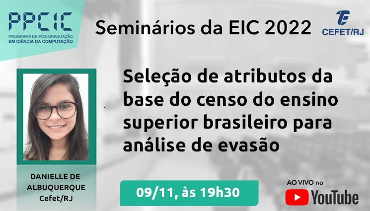 9/11/2022 – Seminários da Escola de Informática e Computação (SEIC) – “Seleção de atributos da base do censo do ensino superior brasileiro para análise de evasão”