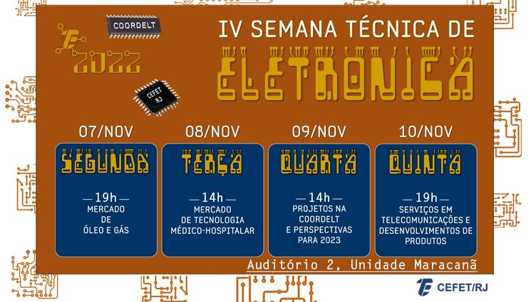 Entre os dias 7 e 10 de novembro, o Cefet/RJ irá promover a semana do curso técnico em Eletrônica da Unidade Maracanã. A IV Semana Técnica de Eletrônica terá uma programação com quatro dias de palestras que abordam temas sobre o mercado e as perspectivas tecnológicas de serviços e de produtos na área. As palestras irão ocorrer no Auditório 2 da unidade.