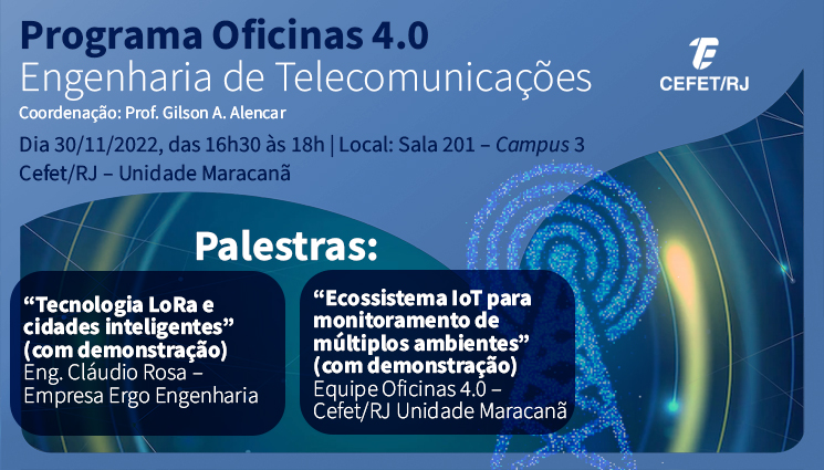 A coordenação do projeto “Ecossistema IoT para monitoramento de múltiplos ambientes”, desenvolvido no âmbito do programa Oficinas 4.0 do Cefet/RJ, irá promover duas palestras na Unidade Maracanã, no próximo dia 30 de novembro. O evento está programado para ocorrer das 16h30 às 18h, na sala 201 do Campus 3.