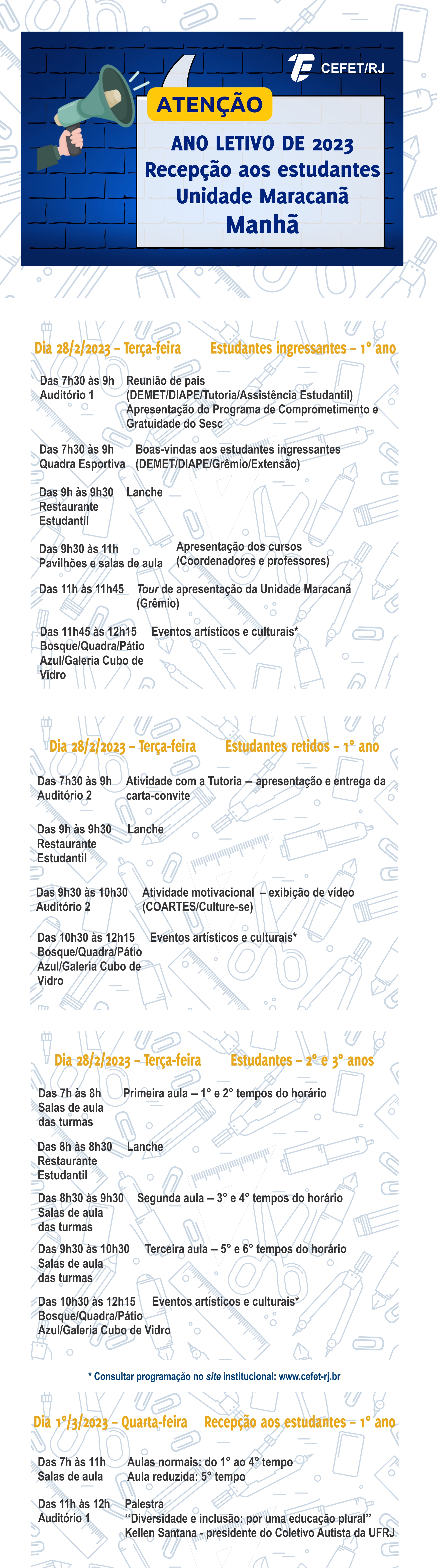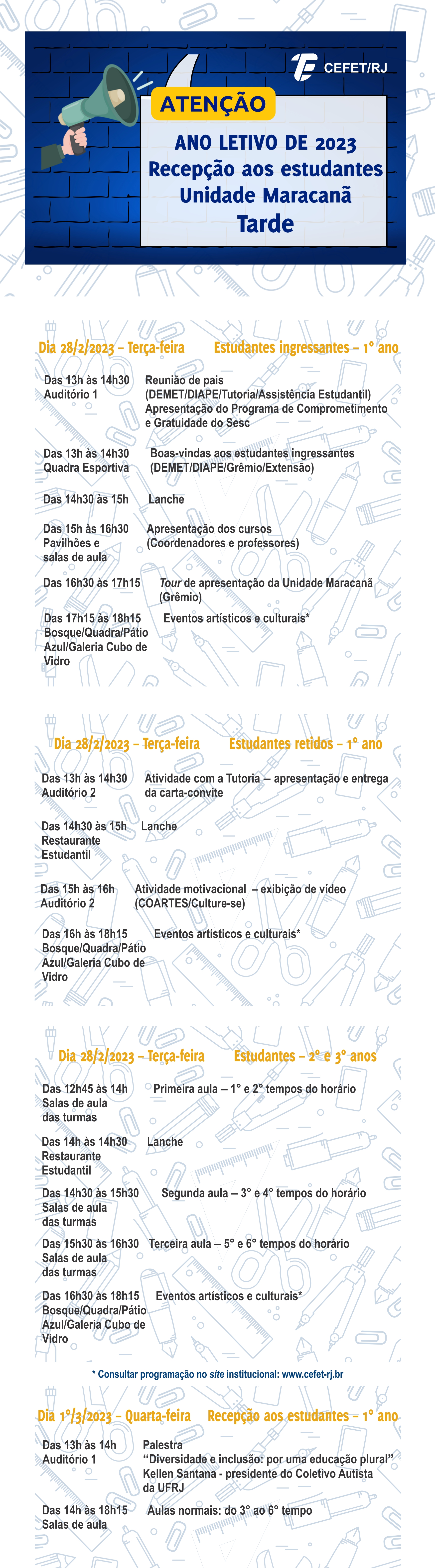 Nos dias 28/2 e 1º/3, o Departamento de Ensino Médio e Técnico (DEMET) irá realizar a recepção aos estudantes dos cursos técnicos integrados ao ensino médio da Unidade Maracanã.