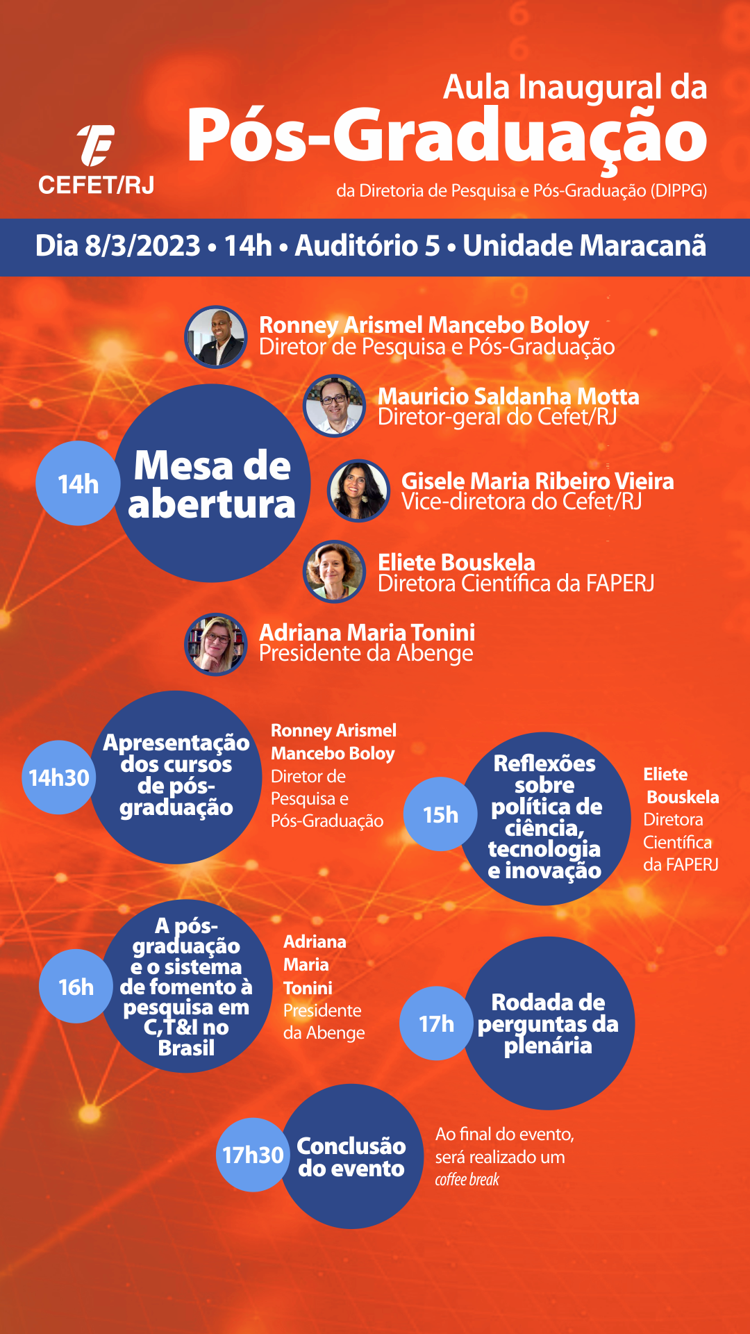 A Diretoria de Pesquisa e Pós-Graduação (DIPPG) convida os docentes e discentes para participarem da aula inaugural, a ser realizada no dia 8/3/2023, às 14h, no Auditório 5 da Unidade Maracanã.