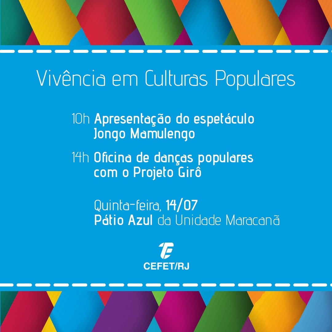 Nesta quinta-feira (14), o Cefet/RJ Unidade Maracanã terá um dia dedicado às atividades artísticas intitulado “Vivência em Culturas Populares”. A partir das 10h, o Pátio Azul...
