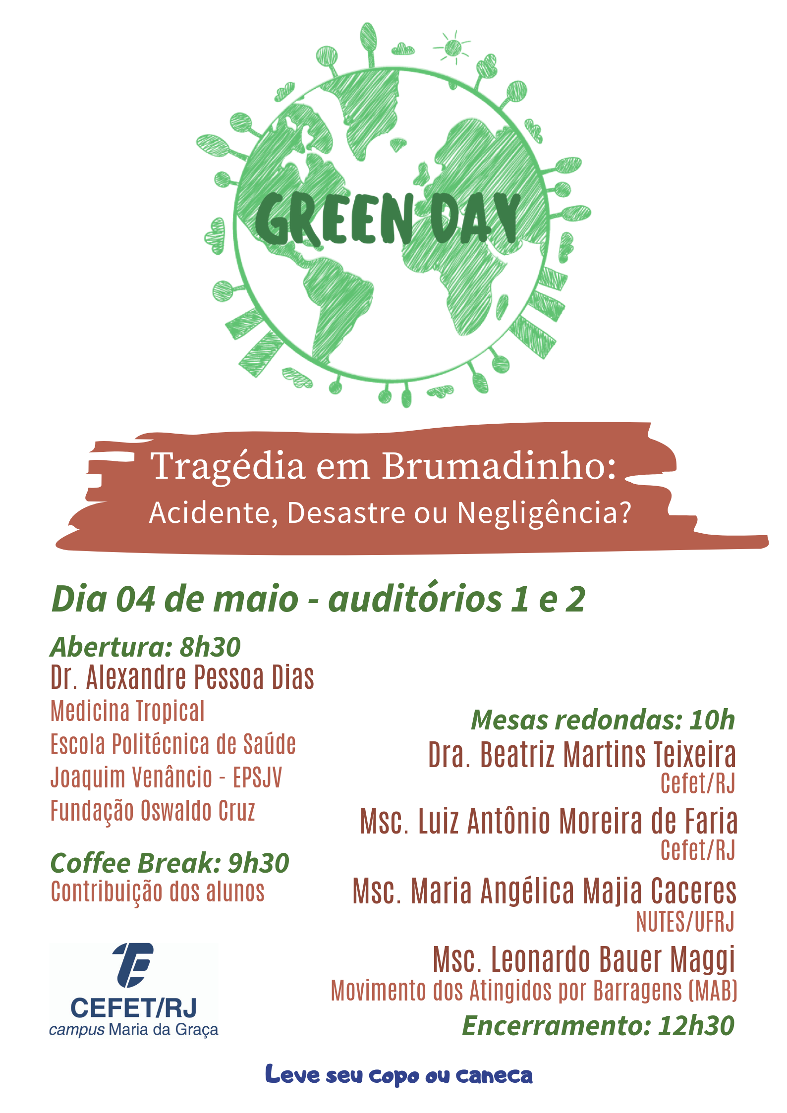 No sábado, dia 4 de maio, será realizada, no campus Maria da Graça, a quarta edição do Green Day, a partir das 8h30. O evento, que terá palestra, coffee break e mesas-redondas, abordará o tema "Tragédia em Brumadinho: acidente, desastre ou negligência?". As atividades serão realizadas nos Auditórios 1 e 2.