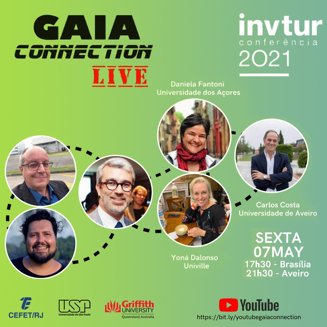 Fechando os trabalhos da INVTUR 2021, em edição especial, o “Gaia Connection Live” recebe os professores Carlos Costa (chair da conferência da Universidade de Aveiro), Daniela Fantoni Alvares (Universidade dos Açores) e Yoná Dalonso (Univille) para uma live, hoje (07/05), às 17h30, no horário de Brasília.