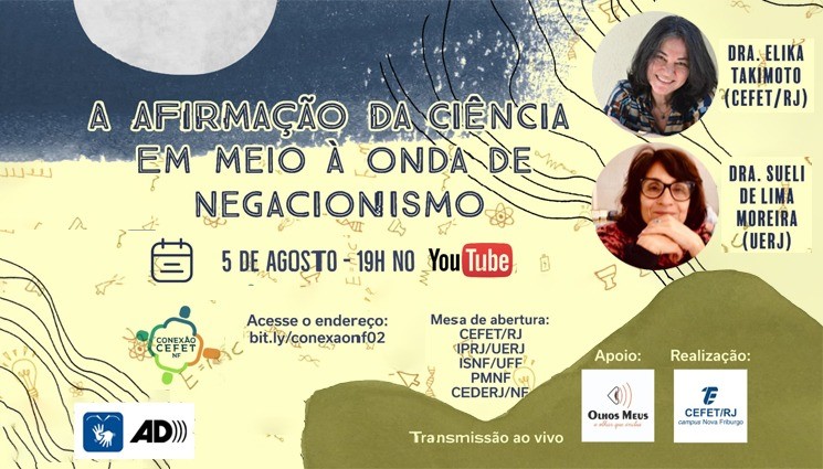 O Cefet/RJ campus Nova Friburgo realiza, nesta quinta-feira (5), a aula magna “A afirmação da ciência em meio à onda de negacionismo”, com Elika Takimoto e Sueli de Lima Moreira. A atividade on-line será transmitida pelo YouTube, a partir das 19h, com auxílio de intérprete de Libras e recurso de audiodescrição. O evento tem o apoio do projeto de extensão Olhos Meus e é direcionado ao público em geral. Os participantes terão direito a certificado.
