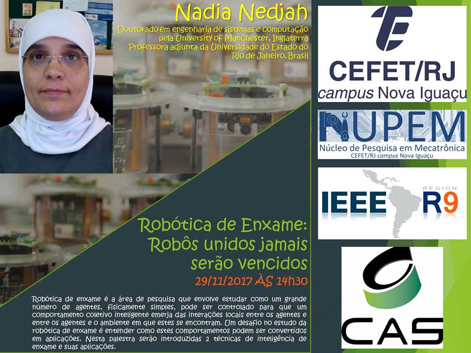 O Núcleo de Pesquisa em Mecatrônica (Nupem/Cefet/RJ campus Nova Iguaçu) tem o prazer de anunciar a Palestra "Robótica de enxame: robôs unidos jamais serão vencidos", que será proferida pela Prof.ª Nadia Nedjah, da Faculdade de Engenharia da Universidade do Estado do Rio de Janeiro (FEN/Uerj). A palestra é uma ação da seção regional do CASS/IEEE, presidida por Amaro A. de Lima, professor do curso técnico em Telecomunicações do campus Nova Iguaçu e do Programa de Pós-graduação em Engenharia Elétrica do Cefet/RJ. O evento parte do projeto de extensão "Ciclo de seminários em Nova Iguaçu: pesquisas na área tecnológica", coordenado por Diego Nunes Brandão, professor do curso técnico de Informática do campus Nova Iguaçu e do Programa de Pós-graduação em Ciência da Computação (PPCIC/Cefet/RJ), e conta com a colaboração dos demais professores do Nupem. A palestra ocorrerá no dia 29/11 (quarta-feira), às 14h30, no anfiteatro do campus Nova Iguaçu.
