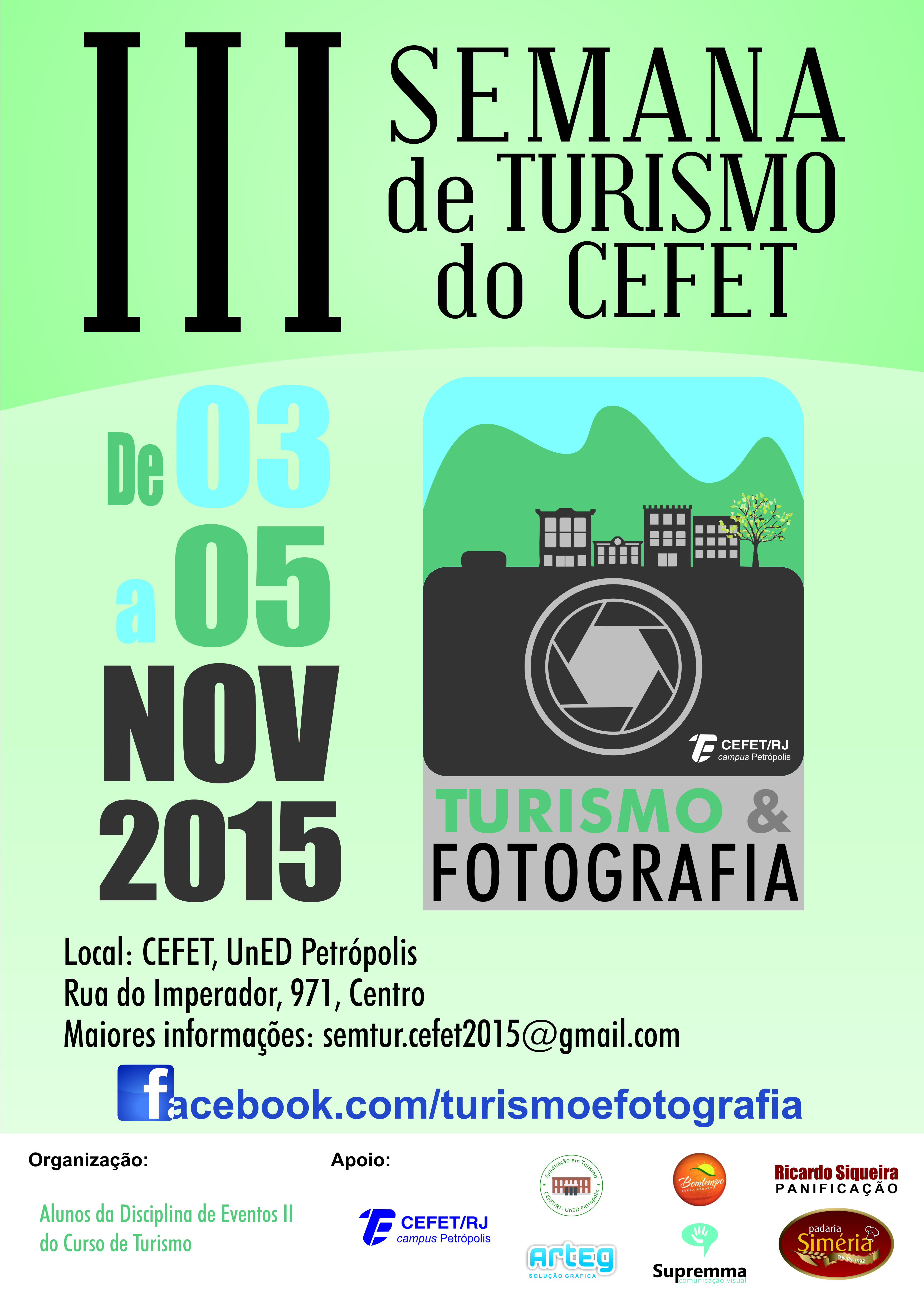 A III Semana de Turismo do Cefet/RJ – campus Petrópolis será realizada, nas dependências da instituição, nos dias 3, 4 e 5 de novembro de 2015. Com o tema “Turismo e Fotografia”, o evento tem o objetivo de abordar assuntos como o imaginário turístico da cidade de Petrópolis e o consumo da imagem, assim como promover a reflexão sobre o uso da fotografia como ferramenta de auxílio ao setor turístico.