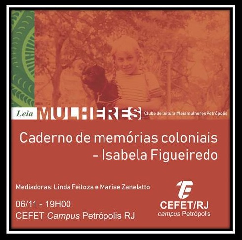 A literatura portuguesa marcará presença no próximo encontro do clube de leitura Leia Mulheres com o livro Caderno de memórias coloniais, de Isabela Figueiredo. A obra relata a própria história da autora durante sua infância em Moçambique, na época, ainda colônia de Portugal. O evento, que é gratuito e aberto ao público em geral, será realizado no Salão Nobre do Cefet/RJ campus Petrópolis, no dia 6 de novembro, às 19h. A mediação do encontro fica a cargo de Rosane Marques e Linda Feitoza.