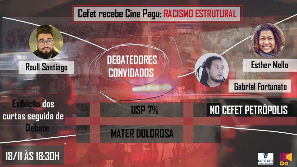Racismo estrutural é o tema do último “Cefet recebe Cine Pagu” do ano. O evento – que acontece às 18h30, no Cefet/RJ campus Petrópolis – exibirá e debaterá dois curtas-metragens: “USP 7%”, de Daniel Mello e Bruno Bocchini, e “Mater Dolorosa”, de Daniel Caetano e Tamur Aimara.