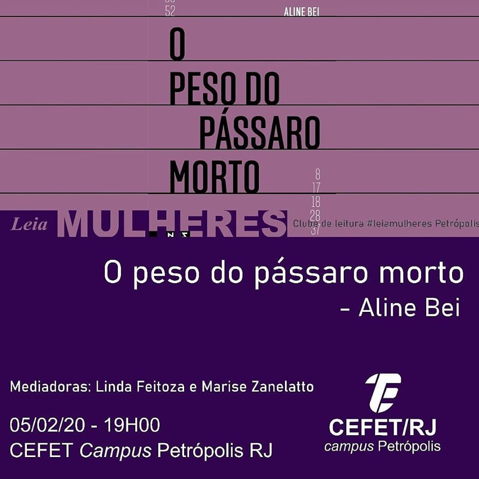 Na próxima quarta-feira, dia 5 de fevereiro, o Cefet/RJ campus Petrópolis recebe o clube de leitura Leia Mulheres para debater o livro O peso do pássaro morto, de Aline Bei, consagrado pelo Prêmio São Paulo de Literatura de 2018. O livro conta a história de uma mulher dos 8 aos 52 anos, numa trajetória marcada por perdas. O encontro será realizado às 19h no Salão Nobre e contará com a mediação de Linda Feitoza e Marise Zanelatto. O evento é gratuito e aberto ao público.