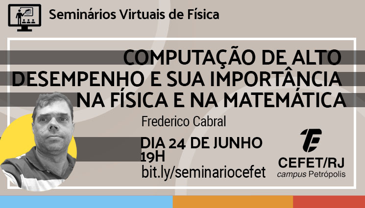 A sexta apresentação do projeto Seminários Virtuais será realizada na próxima quarta-feira, dia 24 de junho, e terá como tema a “Computação de alto desempenho e sua importância na Física e na Matemática”. O encontro será ministrado pelo ex-aluno da licenciatura em Física do Cefet/RJ campus Petrópolis Frederico Luís Cabral, que possui ainda graduação em Ciência da Computação pela Universidade Católica de Petrópolis (UCP) e mestrado em Computação pela Universidade Federal Fluminense (UFF). Frederico também é pesquisador do Centro de Pesquisa em Computação de Alto Desempenho do CENAPAD/RJ, do Laboratório Nacional de Computação Científica (LNCC).