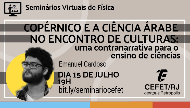 Baseada na pesquisa teórica que fundamentou a defesa de mestrado de Emanuel Cardoso, a próxima apresentação dos Seminários Virtuais de Física terá como tema “Copérnico e a ciência árabe no encontro de culturas: uma contranarrativa para o ensino de ciências”. O encontro será realizado na quarta-feira, dia 15 de julho, às 19h, pelo serviço Conferência Web da RNP e será transmitido a partir do link bit.ly/seminariocefet.