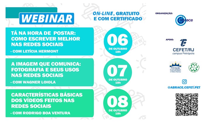 O projeto de extensão Abrace, do Cefet/RJ campus Petrópolis, irá promover mais um ciclo de palestras voltado para o mercado empreendedor. O webinar “Comunique-se! #Não fique de fora da rede”, que será realizado de 6 a 8 de outubro, sempre às 18h, reunirá três palestras on-line sobre conceitos básicos e importantes de produção de texto, fotografia e vídeo para as redes socias. O evento é gratuito e aberto ao público em geral.