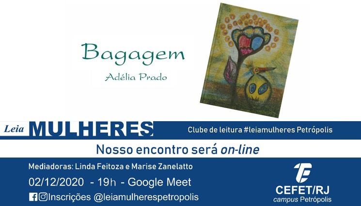 O clube de leitura Leia Mulheres irá fechar o ano de 2020 com a obra de uma das maiores escritoras brasileiras: Bagagem, de Adélia Prado. O livro de estreia da autora mineira é composto por uma coletânea de poesia e é dividido em cinco partes: O modo poético, Um jeito e amor, A sarça ardente I, A sarça ardente II e Alfândega.