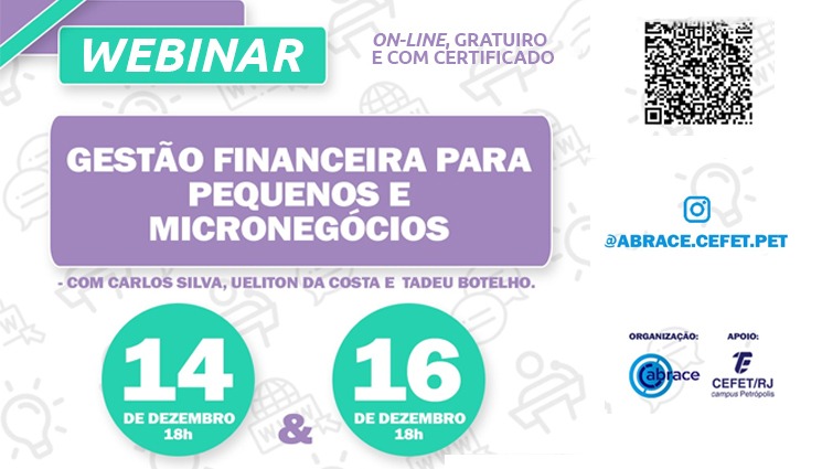O projeto de extensão Abrace, do Cefet/RJ campus Petrópolis, realizará, nos dias 14 e 16 de dezembro, o último ciclo de palestras do ano, voltado para o mercado empreendedor. O evento terá como temática a “Gestão financeira para pequenos e micronegócios” e contará com a participação de Carlos Silva, Ueliton da Costa e Tadeu Botelho, servidores do campus Petrópolis e profissionais atuantes na área administrativa e contábil. As palestras, que são gratuitas e abertas ao público em geral, serão realizadas a partir das 18h pela plataforma Conferência Web da RNP.