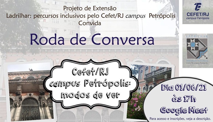 O projeto de extensão “Ladrilhar: percursos inclusivos” realizará, na terça-feira, dia 1º de junho, às 17h, a roda de conversa “Cefet/RJ campus Petrópolis: modos de ver”. O evento, que é aberto às comunidades interna e externa, busca promover a troca de experiências em relação à percepção do prédio do campus e estimular a reflexão sobre diferentes formas de acesso aos espaços (físico, informacional ou estético).