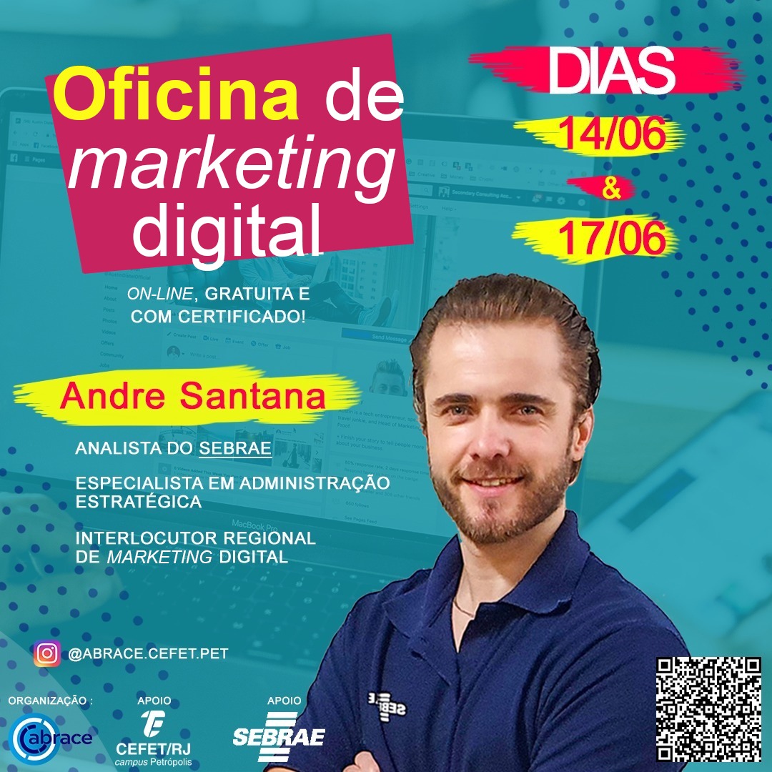 Nos dias 14 e 17 de junho, o projeto de extensão Abrace, do Cefet/RJ campus Petrópolis, irá ofertar gratuitamente a “Oficina de Marketing Digital”. O evento, que conta com a parceria do Sebrae, será ministrado por Andre de Mello Santana, coordenador da Região Serrana II do órgão.