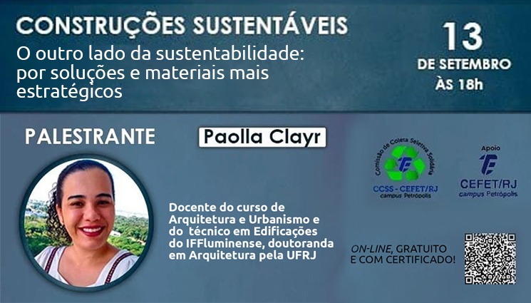 O que vem à sua mente quando falamos de uma construção sustentável? Essa é a questão levantada pela palestra “O outro lado da sustentabilidade: por soluções e materiais mais estratégicos”, organizada pelo projeto de extensão “Cefet/RJ Sustentável: ações da Comissão de Coleta Seletiva Solidária (CCSS) do campus Petrópolis”. O evento acontecerá no dia 13 de setembro, às 18h, pela plataforma Conferência Web da RNP, e será conduzido por Paolla Clayr, do Instituto Federal de Educação, Ciência e Tecnologia Fluminense (IFFluminense).