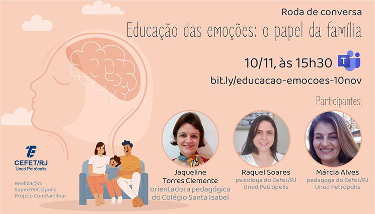 A Seção de Articulação Pedagógica (SAPED) do Cefet/RJ Uned Petrópolis, no âmbito do projeto ComPartilhar, promoverá, na próxima quarta-feira, dia 10 de novembro, às 15h30, a roda de conversa “Educação das emoções: o papel da família”. O evento contará com a participação de Jaqueline Torres Clemente, orientadora pedagógica do Colégio Santa Isabel (Petrópolis), e da psicóloga e da pedagoga da Uned Petrópolis Raquel Soares e Márcia Alves, respectivamente.