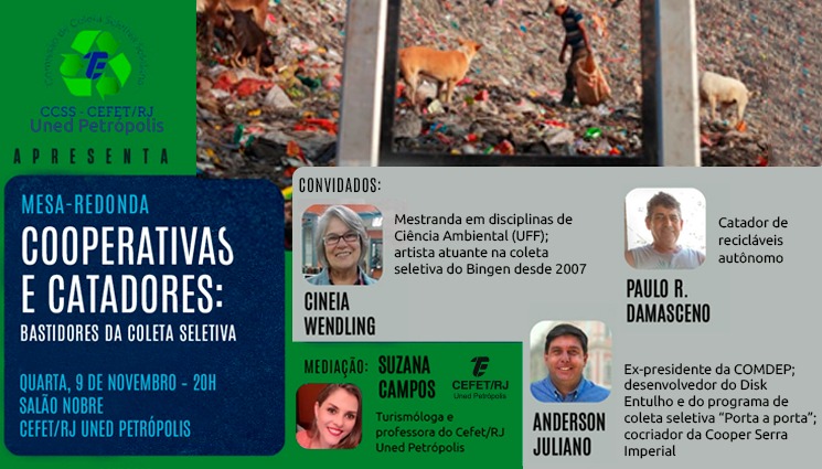 O evento contará com a participação do gestor público e criador do programa de coleta seletiva “Porta a porta”, Anderson Juliano; da artista, mestranda em Ciência Ambiental e criadora do projeto “Brinque e recicle com a gente”, Cineia Wendling; e do catador autônomo Paulo Damasceno. A mediação será conduzida pela professora do Cefet/RJ Uned Petrópolis Suzana Campos.