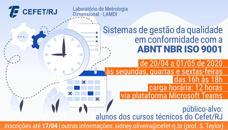 Entre os dias 20 de abril e 1º de maio, será ministrado, de forma on-line, o curso “Sistemas de gestão da qualidade em conformidade com a ABNT NBR ISO 9001:2015”, com o objetivo de apresentar os requisitos dessa norma específica e a sua aplicação na melhoria do desempenho das empresas.
