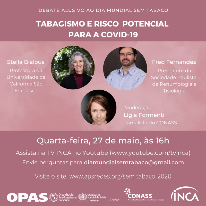 A iniciativa da Organização Pan-americana da Saúde (OPAS/OMS) no Brasil – com o apoio do Instituto Nacional de Câncer (INCA) e do Conselho Nacional de Secretários de Saúde (Conass) –, em alusão ao Dia Mundial sem Tabaco (31 de maio), ocorrerá no dia 27 de maio de 2020 (quarta-feira), às 16 horas.