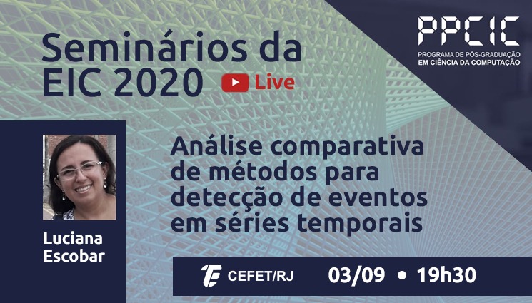 O projeto Seminários da Escola de Informática e Computação (SEIC) realiza, na quinta-feira (03/09), um encontro virtual que terá como tema “Análise comparativa de métodos para detecção de eventos em séries temporais”. A iniciativa é do Programa de Pós-graduação em Ciência da Computação (PPCIC) do Cefet/RJ. O encontro terá como palestrante a aluna Luciana Escobar, que pesquisa sobre o assunto sob a orientação dos professores Laura Assis e Eduardo Ogasawara. A live inicia às 19h30 e será transmitida pelo canal do PPCIC no YouTube.