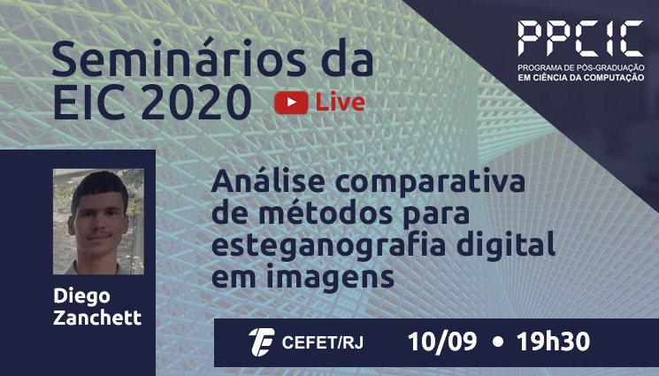 Na próxima quinta-feira (10/09), o projeto Seminários da Escola de Informática e Computação (SEIC) realiza um encontro virtual que abordará o tema “Análise comparativa de métodos para esteganografia digital em imagens”. O palestrante será Diego Zanchett, aluno do curso de Engenharia da Computação do Cefet/RJ campus Petrópolis, que estuda a aplicação e detecção de esteganografia digital em imagens e vídeos. A live inicia às 19h30 e será transmitida pelo canal do Programa de Pós-graduação em Ciência da Computação (PPCIC) do Cefet/RJ no YouTube.