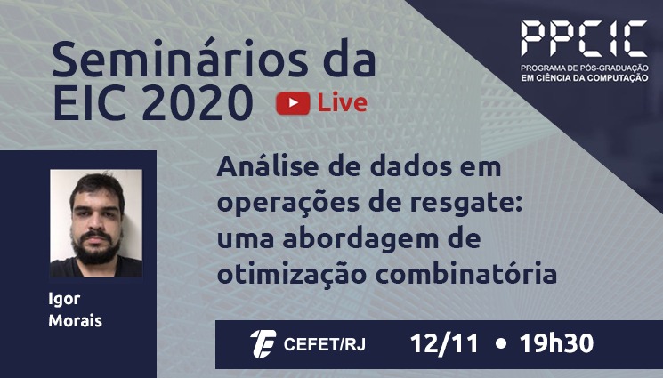 No dia 12 de novembro, o projeto Seminários da Escola de Informática e Computação (SEIC) irá receber o discente Igor da Silva Morais para abordar o tema "Análise de dados em operações de resgate: uma abordagem de otimização combinatória". A live será transmitida às 19h30 pelo canal do Programa de Pós-graduação em Ciência da Computação (PPCIC) no YouTube.